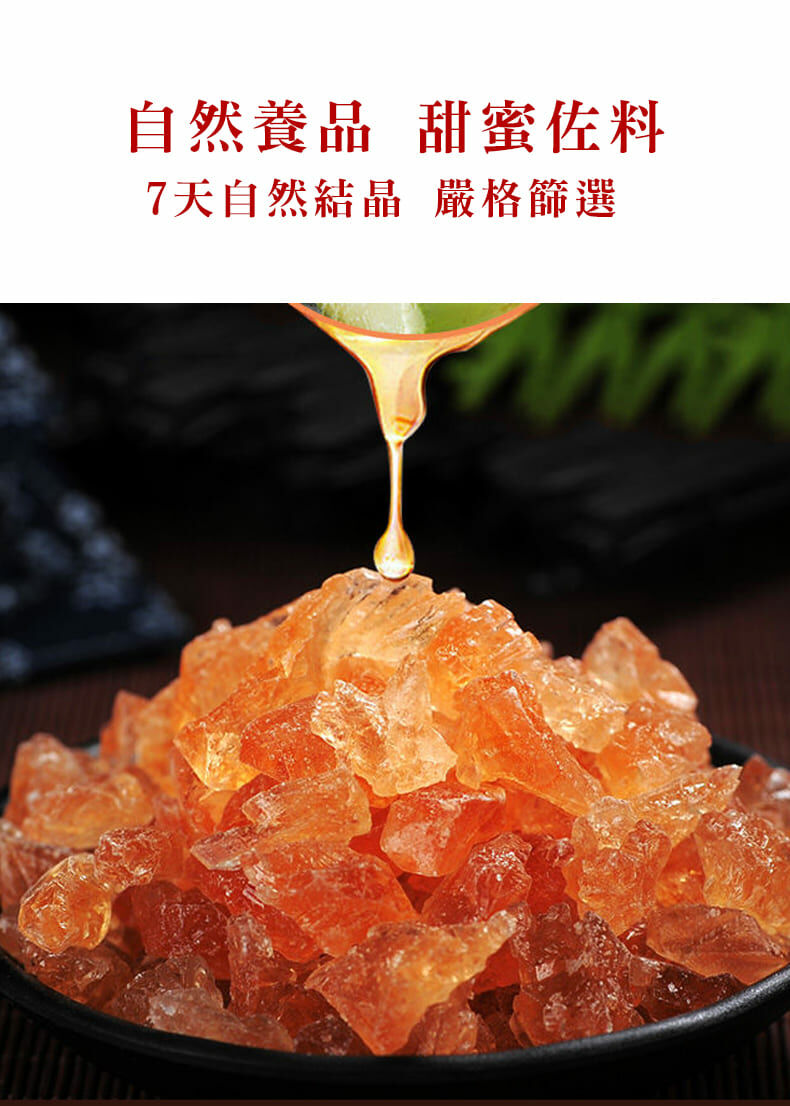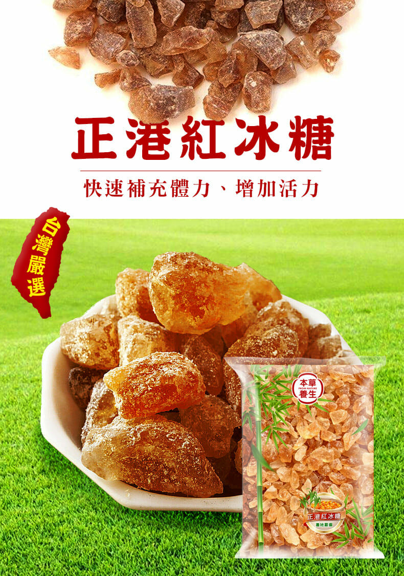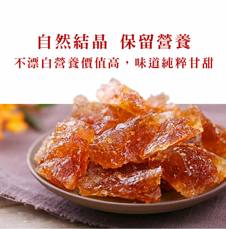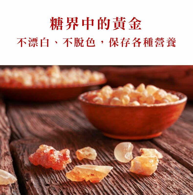 台灣自產自製紅冰糖,採用古法製造,無添加任何化學藥劑;其色亮麗如琥珀,晶瑩剔透。