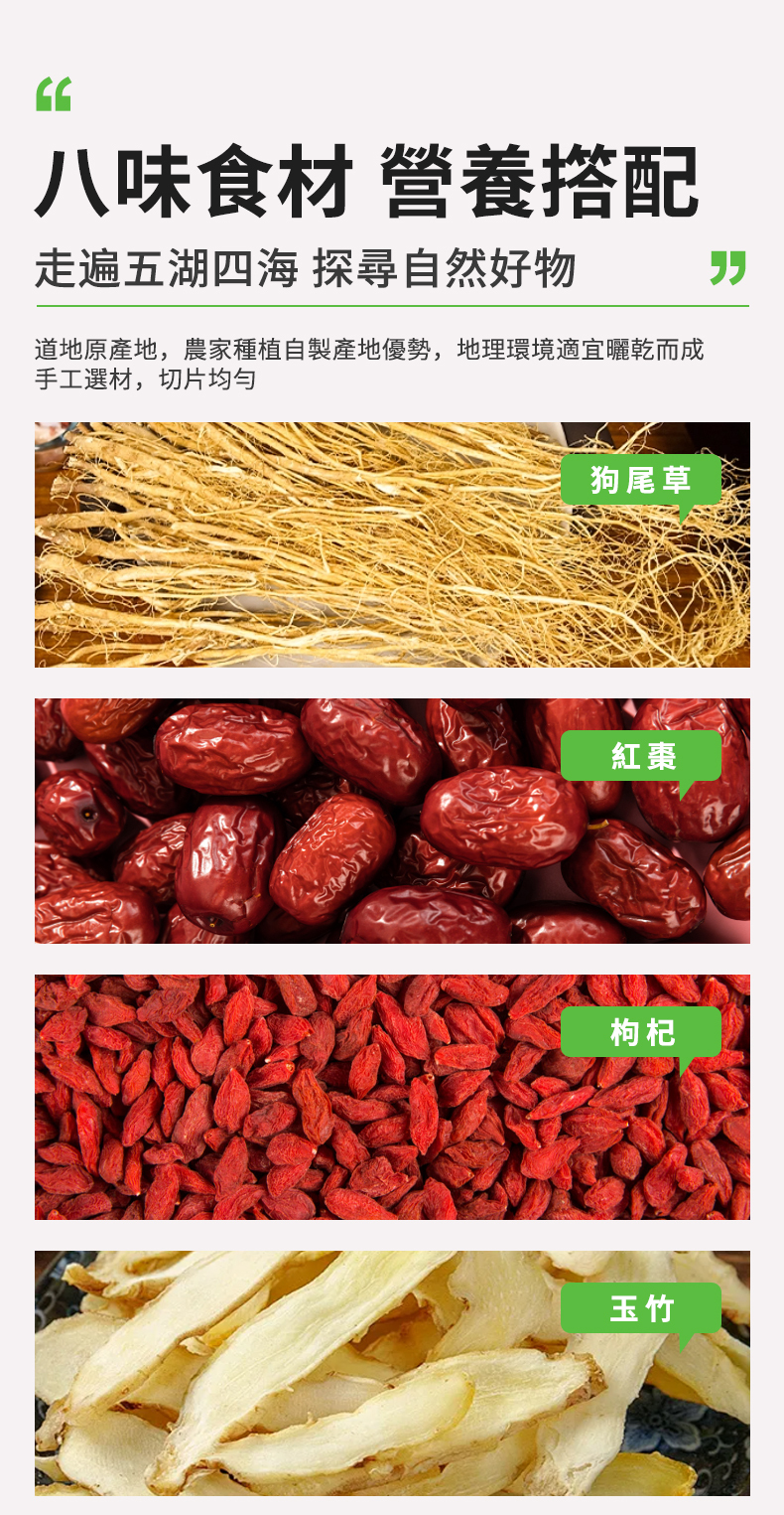 成  份:狗尾草、枸杞、紅棗、玉竹、川芎、黨參、黃耆、甘草