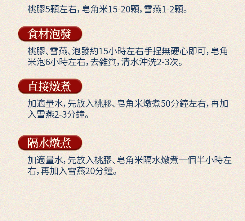 煮熟後香糯潤口,內涵大量膠質,成半透明狀,適合煮粥、煲湯與其他食品一起食用,與紅棗一同熬煮,或加入排骨煲湯,味道十分爽口。