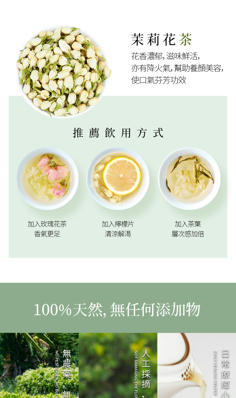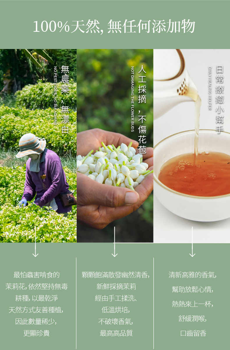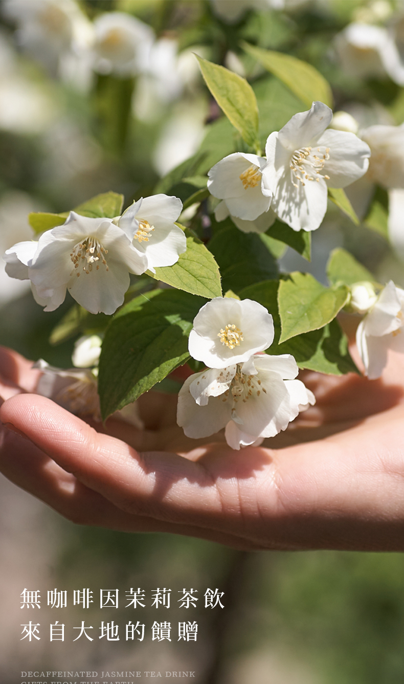 茉莉花生長於熱帶開花植物,屬溫和,最害怕蟲咬食,因此細心呵護更得來不易,手工篩選將細小雜物粉末挑除,留下整朵茉莉花,不漂白、不添加防腐劑,無咖啡因。